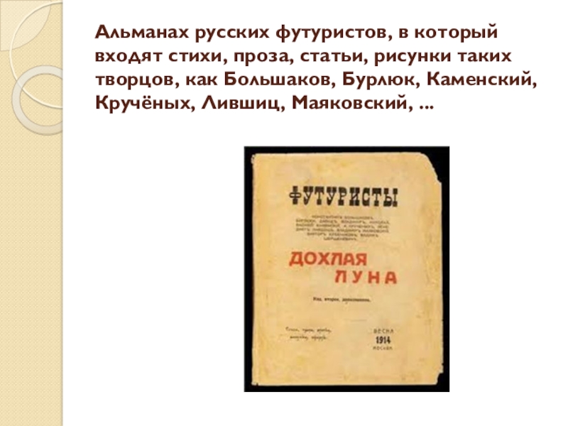 Слайд 11Альманах русских футуристов, в который входят стихи, проза, статьи, рисунки таких