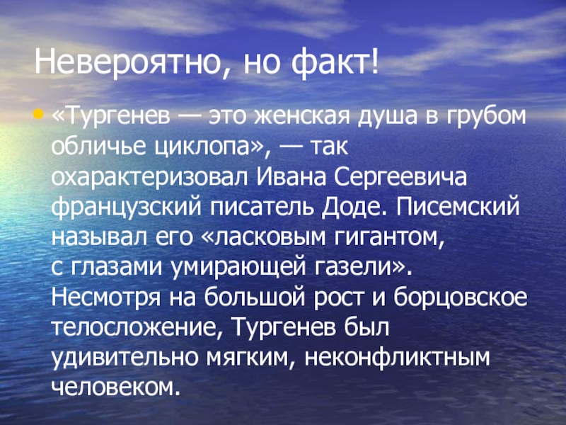 «Тургенев — это женская душа в грубом обличье циклопа», — так охарактеризовал