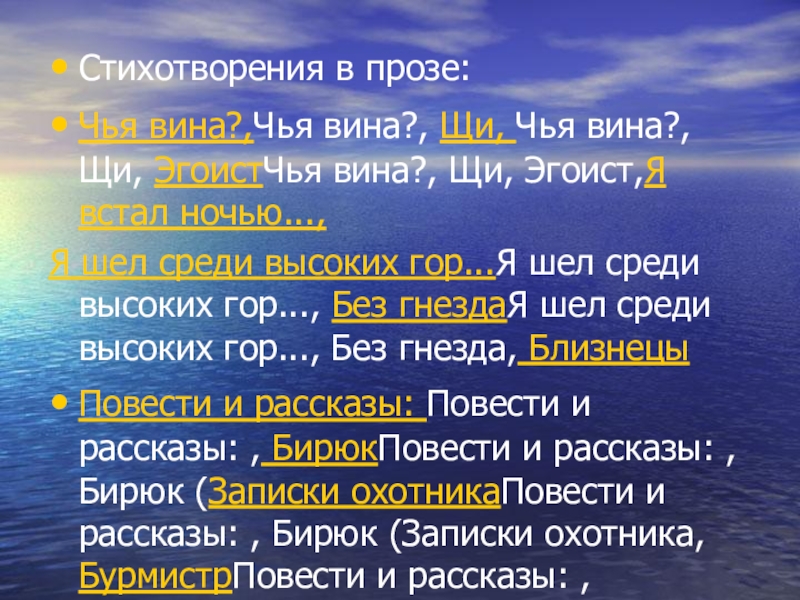Повести и рассказы: Повести и рассказы: , БирюкПовести и рассказы: , Бирюк (Записки охотникаПовести и рассказы: , Бирюк (Записки охотника, БурмистрПовести и рассказы: , Бирюк (Записки охотника, Бурмистр (Записки охотникаПовести и рассказы: , Бирюк (Записки охотника, Бурмистр (Записки охотника), Ермолай и мельничихаПовести и рассказы: , Бирюк (Записки охотника, Бурмистр (Записки охотника), Ермолай и мельничиха (Записки охотникаПовести и рассказы: , Бирюк (Записки охотника, Бурмистр (Записки охотника), Ермолай и мельничиха (Записки охотника), Живые мощиПовести и рассказы: , Бирюк (Записки охотника, Бурмистр (Записки охотника), Ермолай и мельничиха (Записки охотника), Живые мощи (Записки охотникаПовести и рассказы: , Бирюк (Записки охотника, Бурмистр (Записки охотника), Ермолай и мельничиха (Записки охотника), Живые мощи (Записки охотника), МумуПовести и рассказы: , Бирюк (Записки охотника, Бурмистр (Записки охотника), Ермолай и мельничиха (Записки охотника), Живые мощи (Записки охотника), Муму, Хорь и КалинычПовести и рассказы: , Бирюк (Записки охотника, Бурмистр (Записки охотника), Ермолай и мельничиха (Записки охотника), Живые мощи (Записки охотника), Муму, Хорь и Калиныч (Записки охотника)