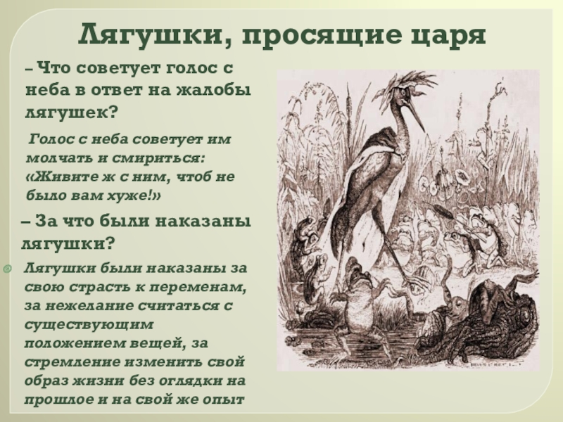 Лягушки были наказаны за свою страсть к переменам, за нежелание считаться с существующим положением вещей, за стремление изменить свой образ жизни без оглядки на прошлое и на свой же опыт