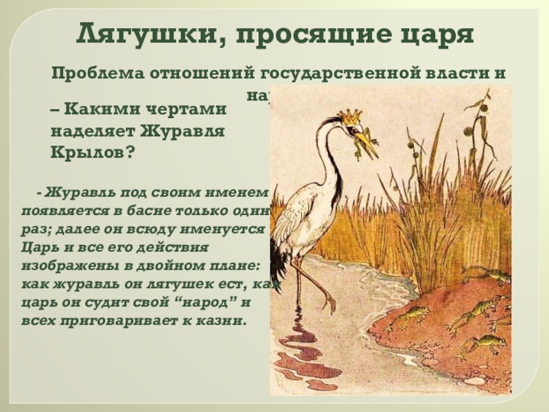 - Журавль под своим именем появляется в басне только один раз; далее он всюду именуется Царь и все его действия изображены в двойном плане: как журавль он лягушек ест, как царь он судит свой “народ” и всех приговаривает к казни.