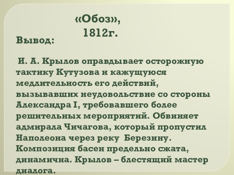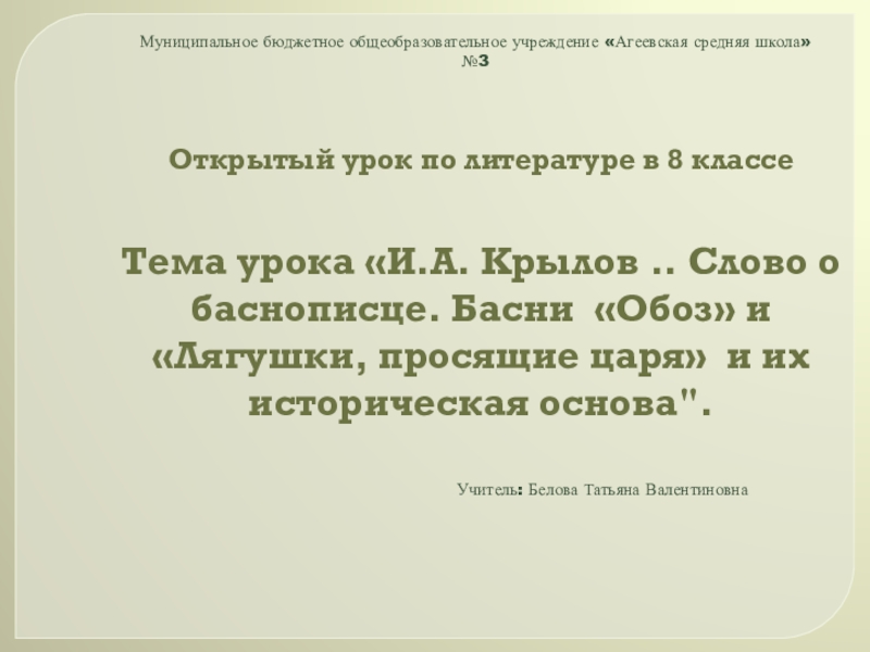 Тема урока «И.А. Крылов .. Слово о баснописце. Басни «Обоз» и «Лягушки, просящие царя» и их историческая основа".