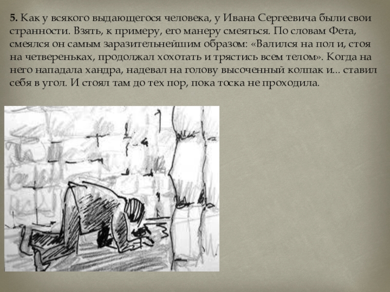 странности. Взять, к примеру, его манеру смеяться. По словам Фета, смеялся он самым заразительнейшим образом: «Валился на пол и, стоя на четвереньках, продолжал хохотать и трястись всем телом». Когда на него нападала хандра, надевал на голову высоченный колпак и... ставил себя в угол. И стоял там до тех пор, пока тоска не проходила.