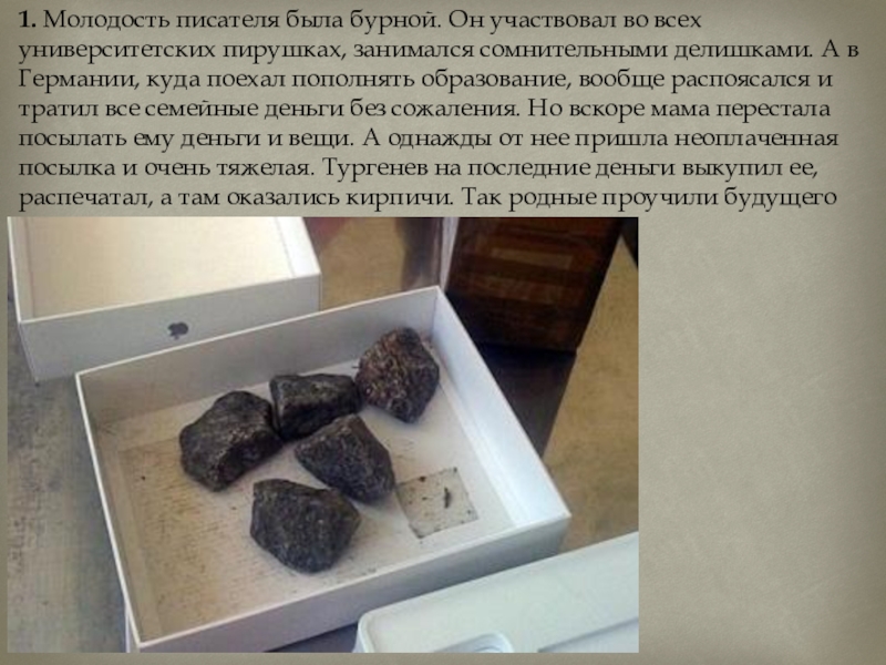занимался сомнительными делишками. А в Германии, куда поехал пополнять образование, вообще распоясался и тратил все семейные деньги без сожаления. Но вскоре мама перестала посылать ему деньги и вещи. А однажды от нее пришла неоплаченная посылка и очень тяжелая. Тургенев на последние деньги выкупил ее, распечатал, а там оказались кирпичи. Так родные проучили будущего великого писателя за мотовство.