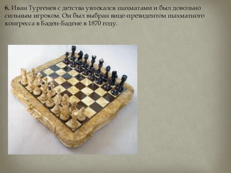 Слайд 66. Иван Тургенев с детства увлекался шахматами и был довольно сильным игроком. Он