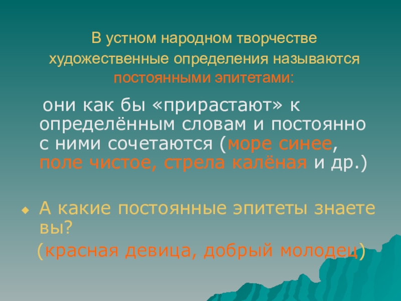 Слайд 16В устном народном творчестве художественные определения называются постоянными эпитетами: