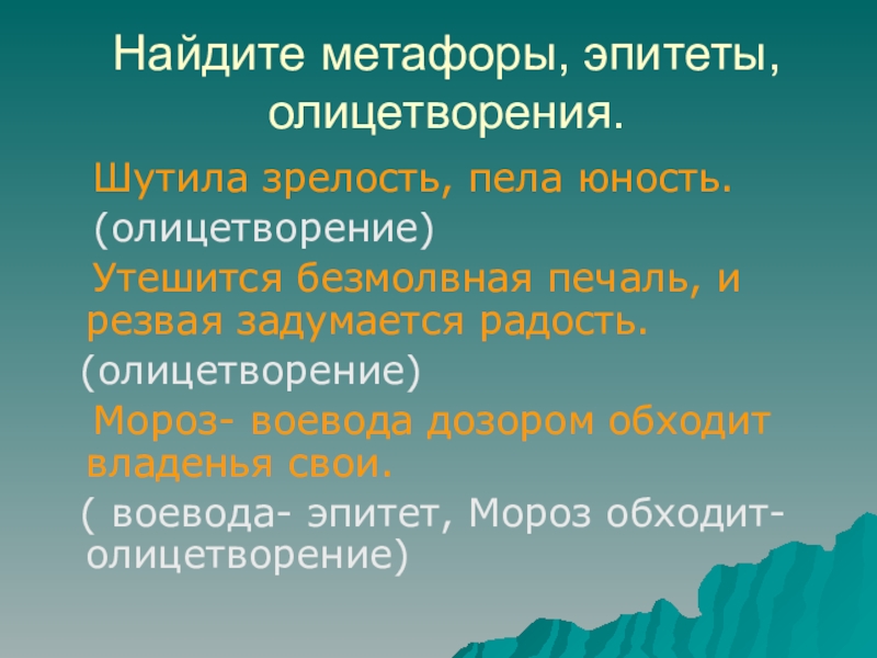 Слайд 21Найдите метафоры, эпитеты, олицетворения.