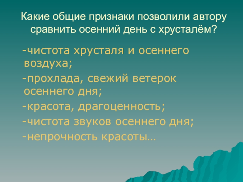 Слайд 5Какие общие признаки позволили автору сравнить осенний день с хрусталём?