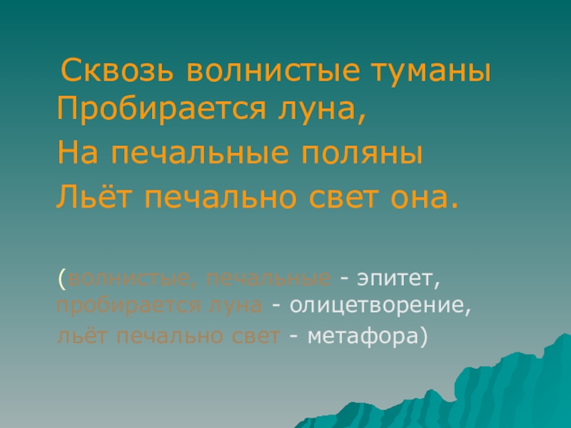 (волнистые, печальные - эпитет, пробирается луна - олицетворение,