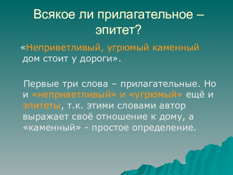 Первые три слова – прилагательные. Но и «неприветливый» и «угрюмый» ещё и эпитеты, т.к. этими словами автор выражает своё отношение к дому, а «каменный» - простое определение.