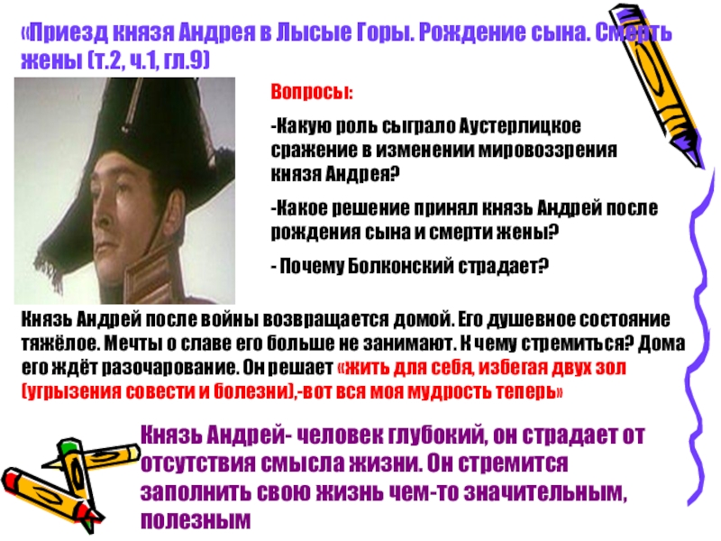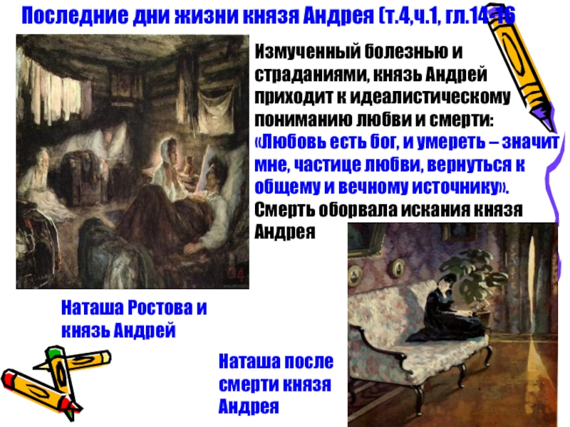 Андрей приходит к идеалистическому пониманию любви и смерти: «Любовь есть бог, и умереть – значит мне, частице любви, вернуться к общему и вечному источнику». Смерть оборвала искания князя Андрея