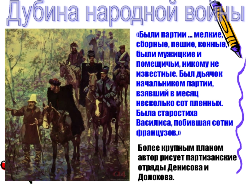 Более крупным планом автор рисует партизанские отряды Денисова и Долохова.