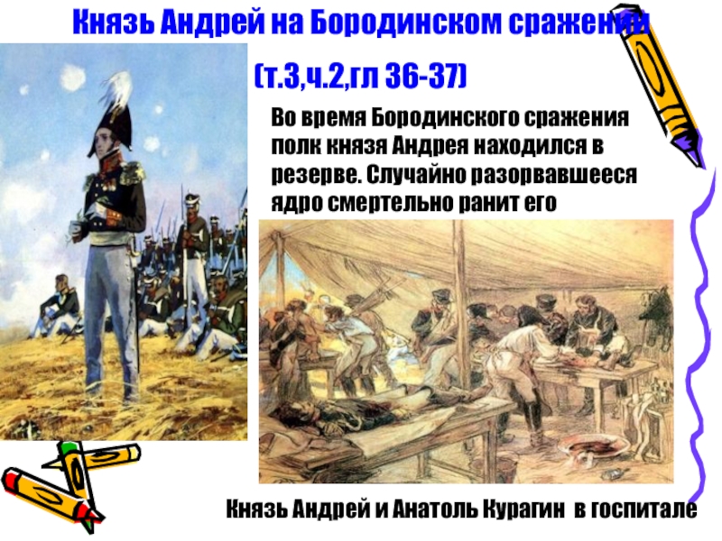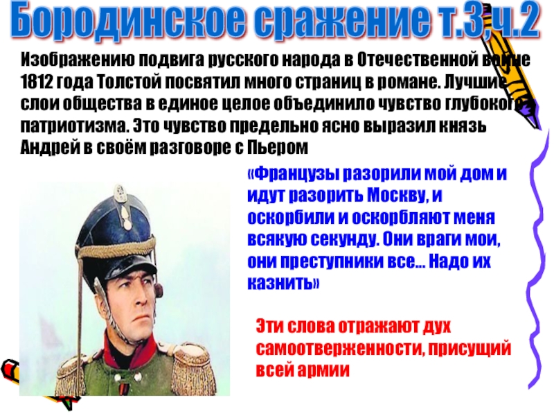 Слайд 44Князь Андрей на Бородинском сражении