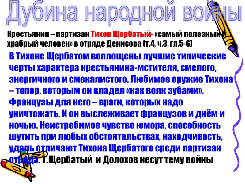 В Тихоне Щербатом воплощены лучшие типические черты характера крестьянина-мстителя, смелого, энергичного и смекалистого. Любимое оружие Тихона – топор, которым он владел «как волк зубами». Французы для него – враги, которых надо уничтожать. И он выслеживает французов и днём и ночью. Неистребимое чувство юмора, способность шутить при любых обстоятельствах, находчивость, удаль отличают Тихона Щербатого среди партизан отряда. Т.Щербатый и Долохов несут тему войны