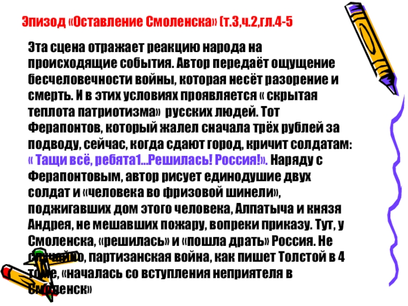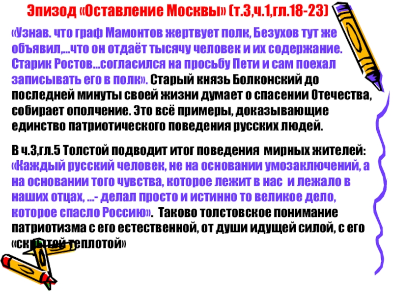 Толстой посвятил много страниц в романе. Лучшие слои общества в единое целое объединило чувство глубокого патриотизма. Это чувство предельно ясно выразил князь Андрей в своём разговоре с Пьером