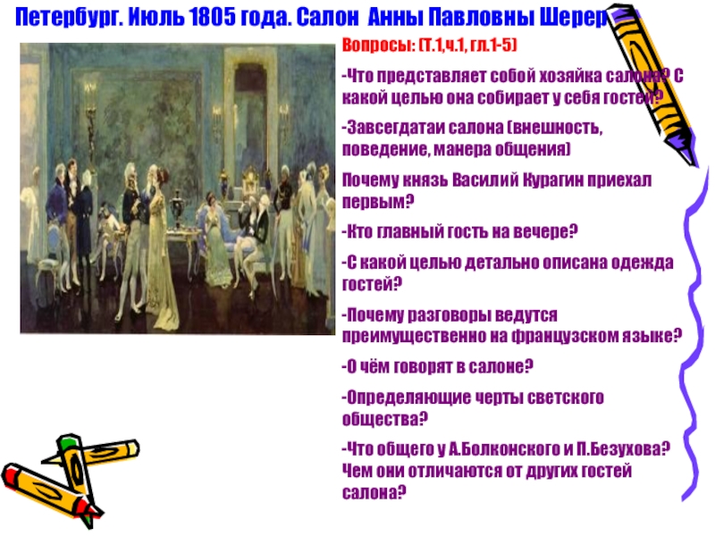 Слайд 7Петербург. Июль 1805 года. Салон Анны Павловны Шерер