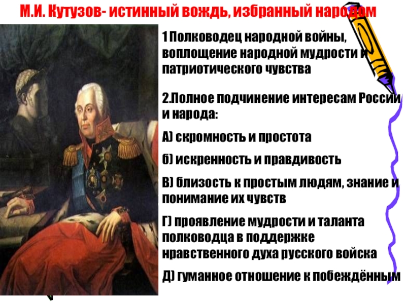 Слайд 54М.И. Кутузов- истинный вождь, избранный народом