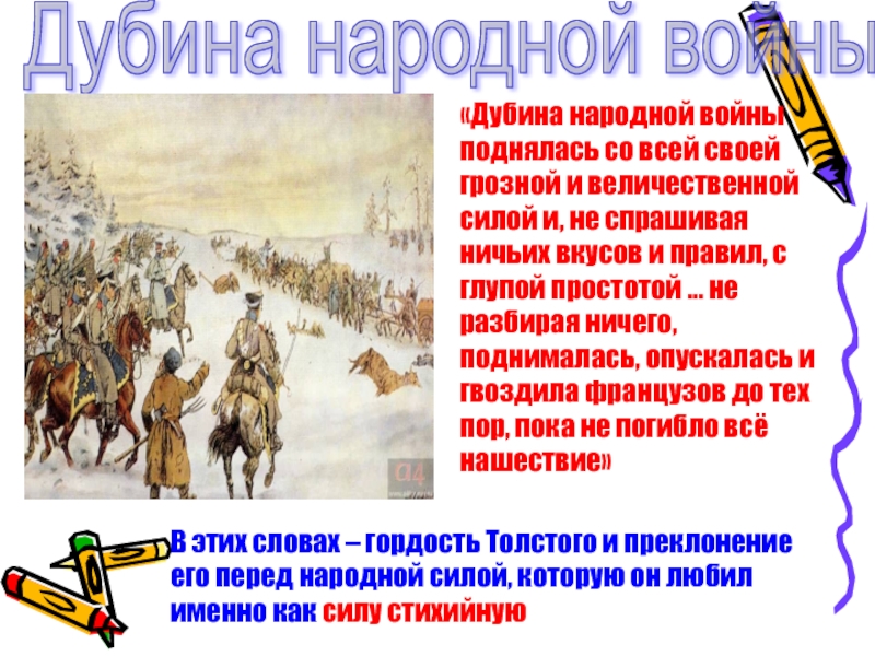 величественной силой и, не спрашивая ничьих вкусов и правил, с глупой простотой … не разбирая ничего, поднималась, опускалась и гвоздила французов до тех пор, пока не погибло всё нашествие»