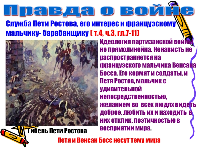 Идеология партизанской войны не прямолинейна. Ненависть не распространяется на французского мальчика Венсана Босса. Его кормят и солдаты, и Петя Ростов, мальчик с удивительной непосредственностью, желанием во всех людях видеть доброе, любить их и находить в них отклик, поэтичностью в восприятии мира.