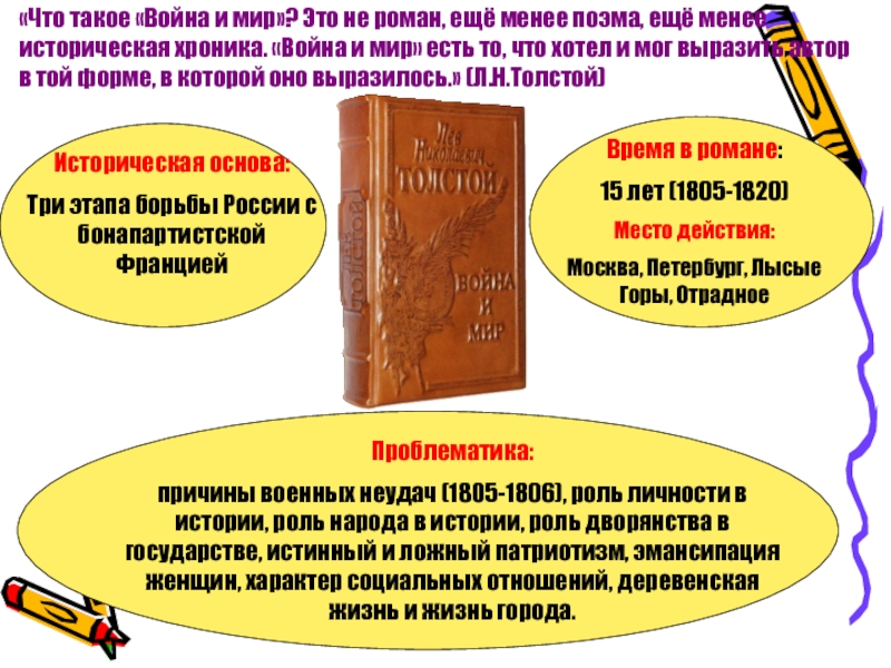 ещё менее историческая хроника. «Война и мир» есть то, что хотел и мог выразить автор в той форме, в которой оно выразилось.» (Л.Н.Толстой)