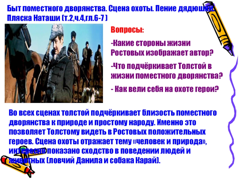 В доме Ростовых царит атмосфера веселья, радости, счастья, искренней заботы о судьбе Родины.