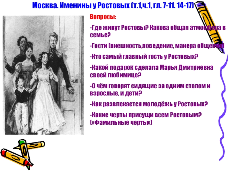 Слайд 9Москва. Именины у Ростовых (т.1,ч.1, гл. 7-11. 14-17)