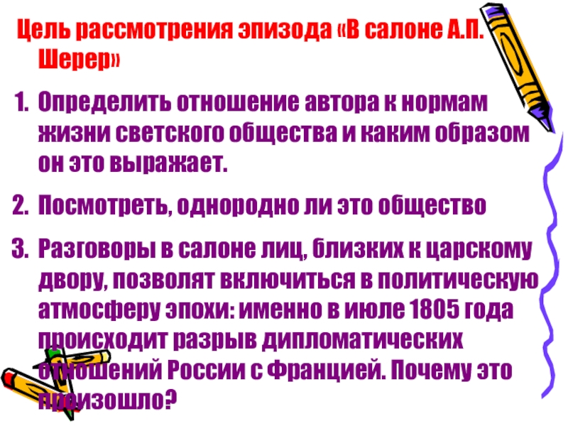 Слайд 6Цель рассмотрения эпизода «В салоне А.П.Шерер»