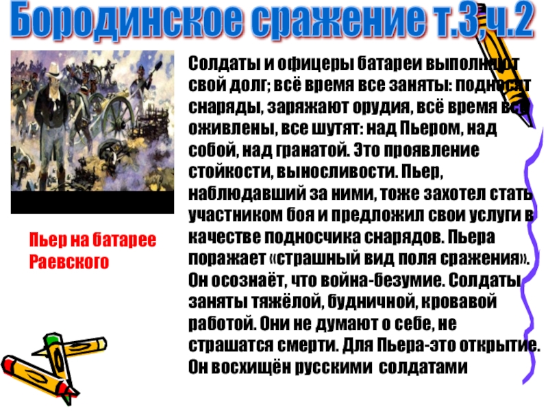 долг; всё время все заняты: подносят снаряды, заряжают орудия, всё время все оживлены, все шутят: над Пьером, над собой, над гранатой. Это проявление стойкости, выносливости. Пьер, наблюдавший за ними, тоже захотел стать участником боя и предложил свои услуги в качестве подносчика снарядов. Пьера поражает «страшный вид поля сражения».Он осознаёт, что война-безумие. Солдаты заняты тяжёлой, будничной, кровавой работой. Они не думают о себе, не страшатся смерти. Для Пьера-это открытие. Он восхищён русскими солдатами