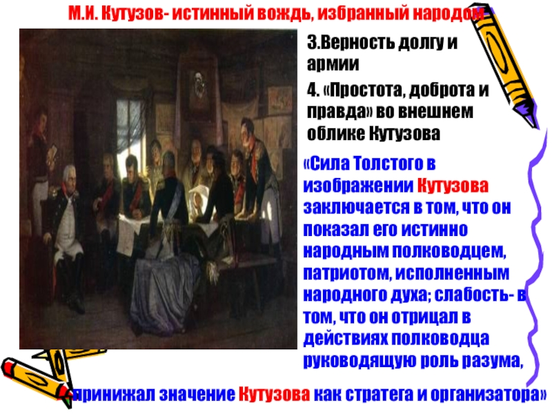 «Сила Толстого в изображении Кутузова заключается в том, что он показал его истинно народным полководцем, патриотом, исполненным народного духа; слабость- в том, что он отрицал в действиях полководца руководящую роль разума,