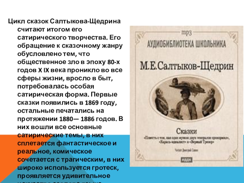 Слайд 2Цикл сказок Салтыкова-Щедрина считают итогом его сатирического творчества. Его обращение к