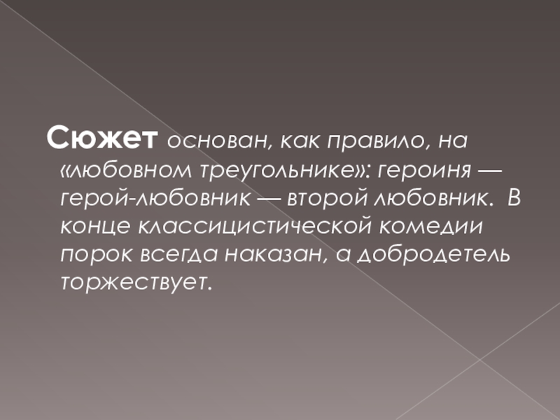 Слайд 16 Сюжет основан, как правило, на «любовном треугольнике»: героиня — герой-любовник