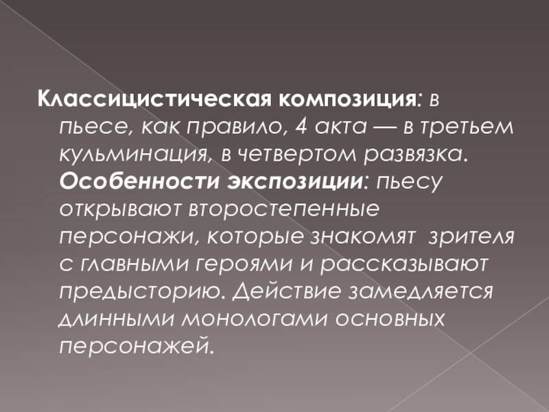 Слайд 20Классицистическая композиция: в пьесе, как правило, 4 акта — в третьем