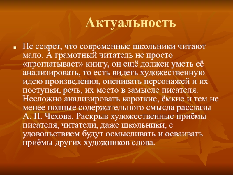 А грамотный читатель не просто «проглатывает» книгу, он ещё должен уметь её анализировать, то есть видеть художественную идею произведения, оценивать персонажей и их поступки, речь, их место в замысле писателя. Несложно анализировать короткие, ёмкие и тем не менее полные содержательного смысла рассказы А. П. Чехова. Раскрыв художественные приёмы писателя, читатели, даже школьники, с удовольствием будут осмысливать и осваивать приёмы других художников слова.