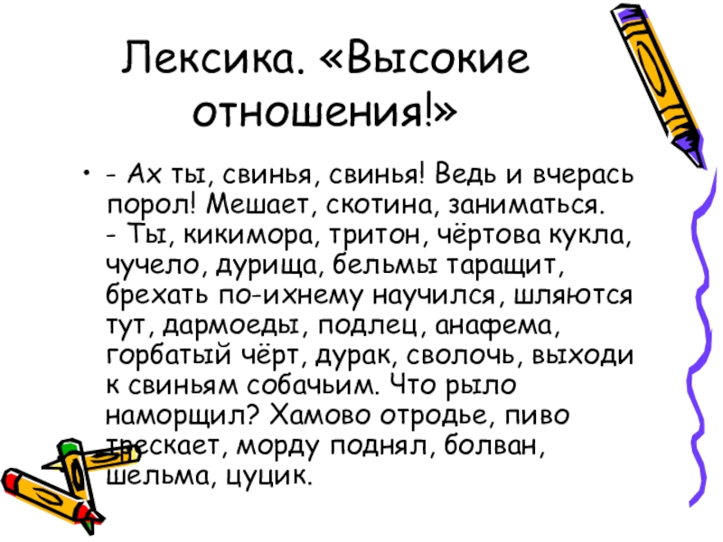 - Ты, кикимора, тритон, чёртова кукла, чучело, дурища, бельмы таращит, брехать по-ихнему научился, шляются тут, дармоеды, подлец, анафема, горбатый чёрт, дурак, сволочь, выходи к свиньям собачьим. Что рыло наморщил? Хамово отродье, пиво трескает, морду поднял, болван, шельма, цуцик.