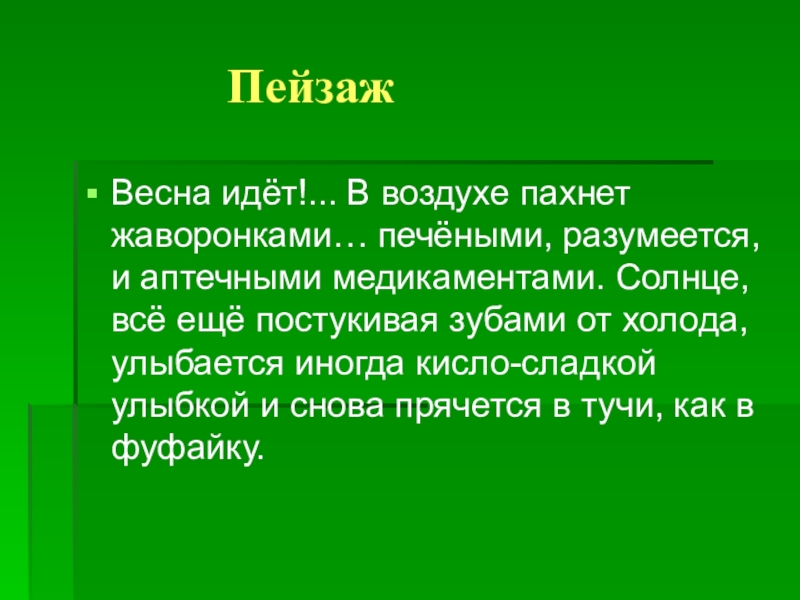 жаворонками… печёными, разумеется, и аптечными медикаментами. Солнце, всё ещё постукивая зубами от холода, улыбается иногда кисло-сладкой улыбкой и снова прячется в тучи, как в фуфайку.