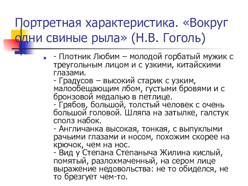 Слайд 10Портретная характеристика. «Вокруг одни свиные рыла» (Н.В. Гоголь)