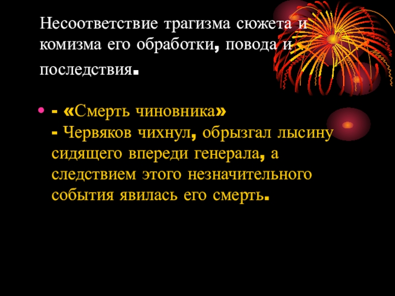 Слайд 12Несоответствие трагизма сюжета и комизма его обработки, повода и последствия.