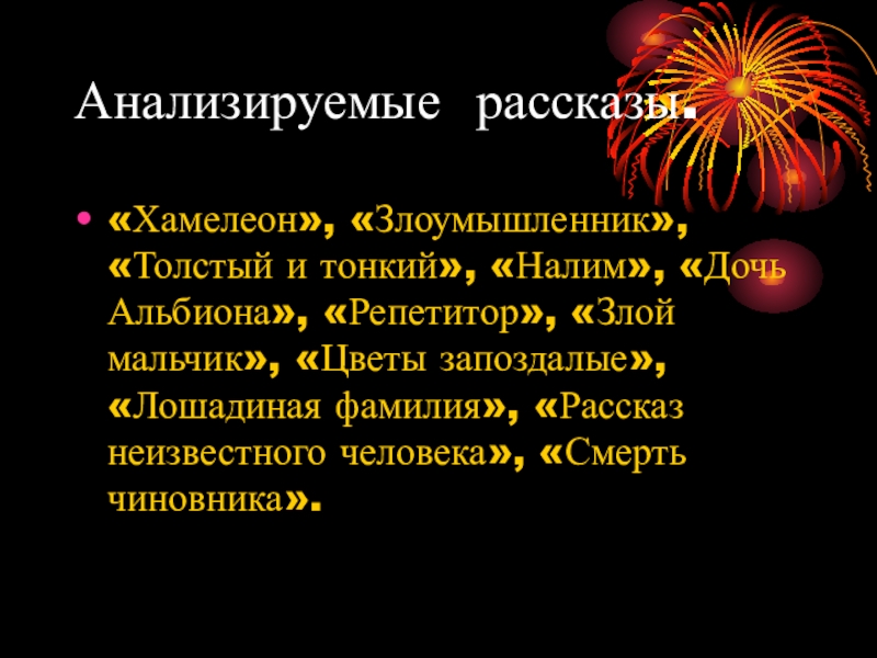 «Хамелеон», «Злоумышленник», «Толстый и тонкий», «Налим», «Дочь Альбиона», «Репетитор», «Злой