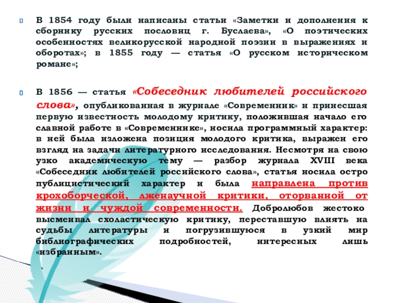 В 1856 — статья «Собеседник любителей российского слова», опубликованная в журнале «Современник» и принесшая первую известность молодому критику, положившая начало его славной работе в «Современнике», носила программный характер: в ней была изложена позиция молодого критика, выражен его взгляд на задачи литературного исследования. Несмотря на свою узко академическую тему — разбор журнала XVIII века «Собеседник любителей российского слова», статья носила остро публицистический характер и была направлена против крохоборческой, лженаучной критики, оторванной от жизни и чуждой современности. Добролюбов жестоко высмеивал схоластическую критику, переставшую влиять на судьбы литературы и погрузившуюся в узкий мир библиографических подробностей, интересных лишь «избранным».
