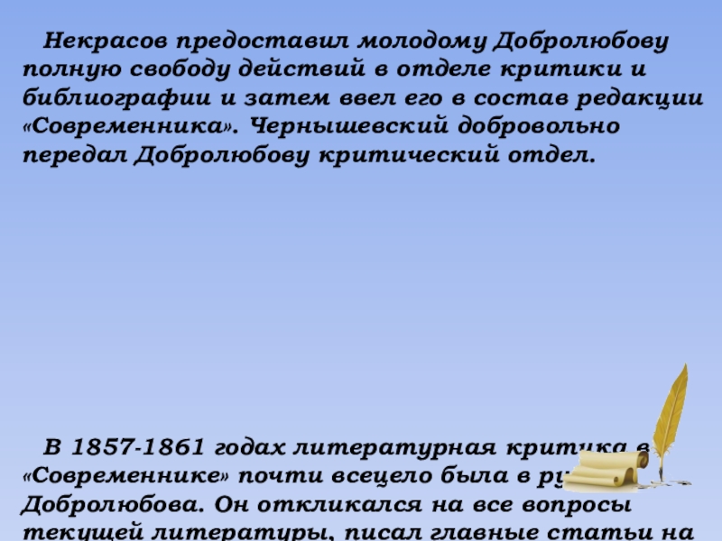 Некрасов предоставил молодому Добролюбову полную свободу действий в отделе критики и