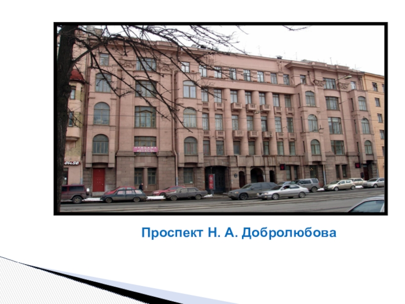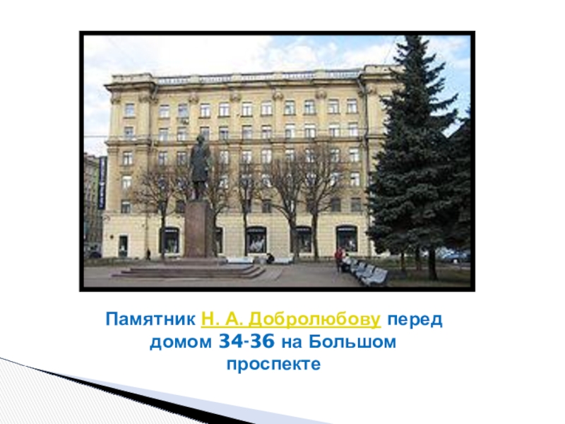 Слайд 34Памятник Н. А. Добролюбову перед домом 34-36 на Большом проспекте