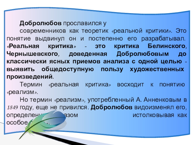Слайд 13Развивая понятие «реальной критики», Добролюбов исходит, казалось бы, из верных положений:
