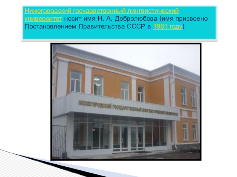 Слайд 31Нижегородский государственный лингвистический университет носит имя Н. А. Добролюбова (имя присвоено Постановлением Правительства