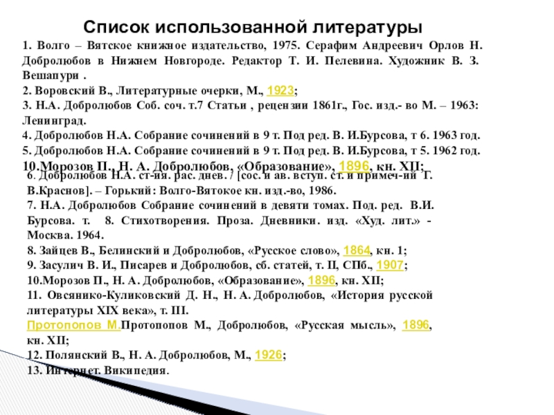 11. Овсянико-Куликовский Д. Н., Н. А. Добролюбов, «История русской литературы XIX века», т. III.