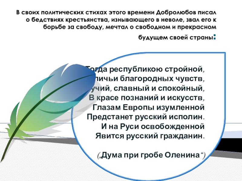 В своих политических стихах этого времени Добролюбов писал о бедствиях крестьянства, изнывающего в неволе, звал его к борьбе за свободу, мечтал о свободном и прекрасном будущем своей страны: