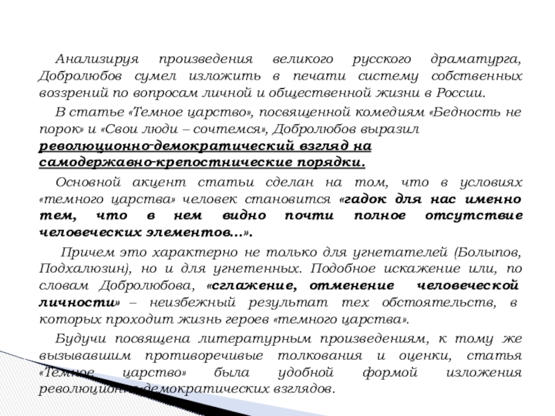 Слайд 22Анализируя произведения великого русского драматурга, Добролюбов сумел изложить в печати систему