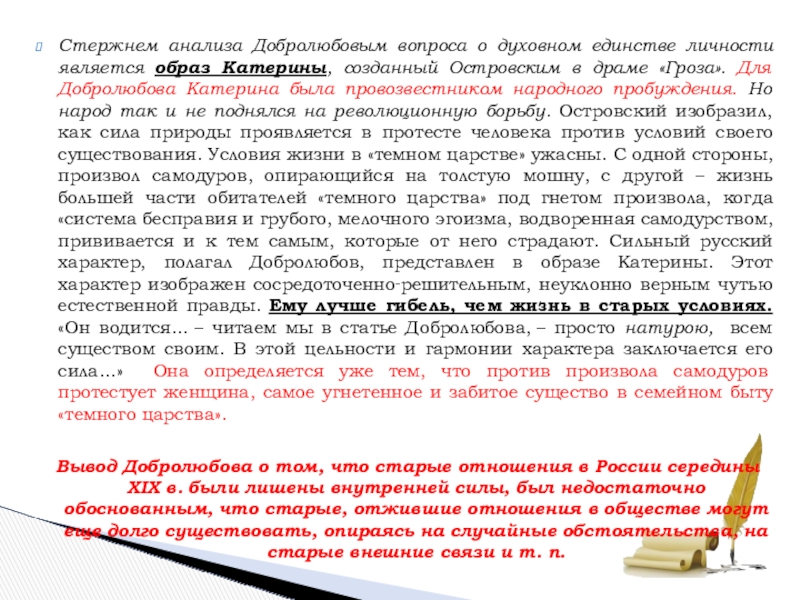 Слайд 21Стержнем анализа Добролюбовым вопроса о духовном единстве личности является образ Катерины,