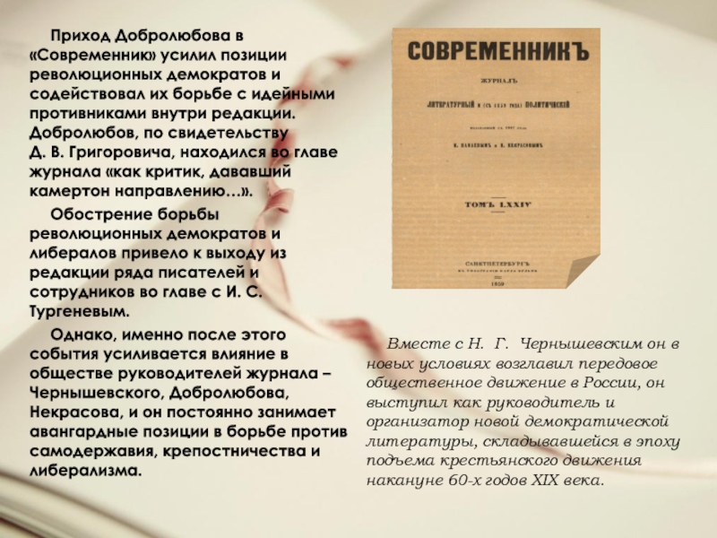 Слайд 14Приход Добролюбова в «Современник» усилил позиции революционных демократов и содействовал их