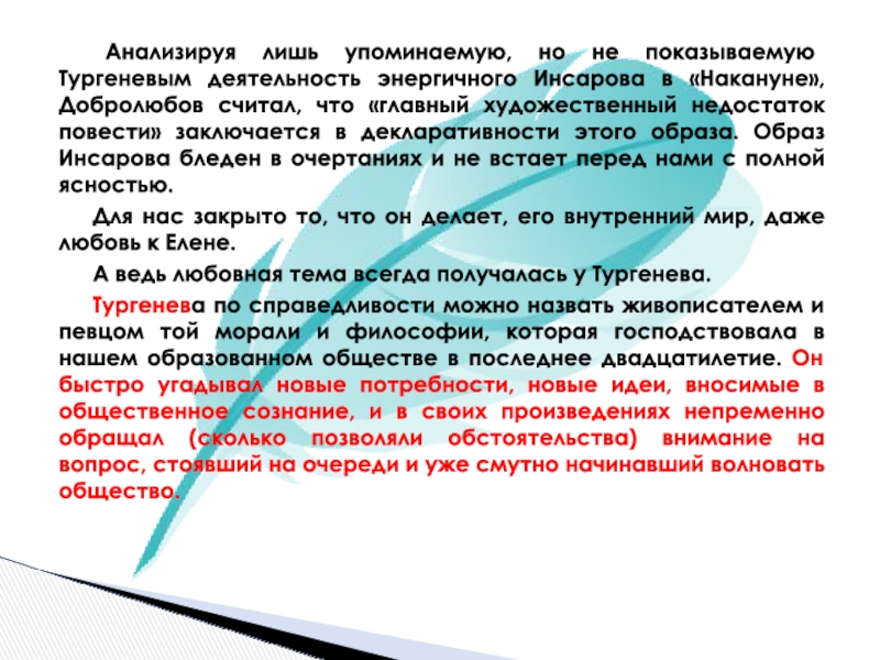 Слайд 25 Анализируя лишь упоминаемую, но не показываемую Тургеневым деятельность энергичного Инсарова