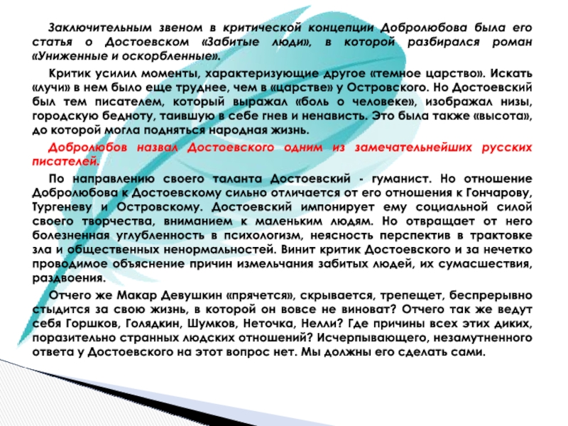По направлению своего таланта Достоевский - гуманист. Но отношение Добролюбова к Достоевскому сильно отличается от его отношения к Гончарову, Тургеневу и Островскому. Достоевский импонирует ему социальной силой своего творчества, вниманием к маленьким людям. Но отвращает от него болезненная углубленность в психологизм, неясность перспектив в трактовке зла и общественных ненормальностей. Винит критик Достоевского и за нечетко проводимое объяснение причин измельчания забитых людей, их сумасшествия, раздвоения.